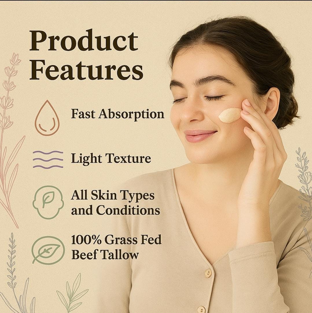 Grass-fed tallow is rich in vitamins A, D, E, and K and closely mimics the skin’s natural oils. It’s incredibly soothing, easily absorbed, and helps restore the skin barrier without clogging pores.